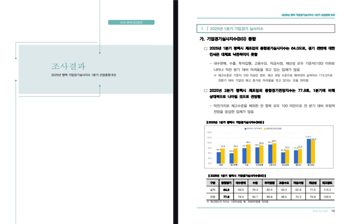 세부내용 분기별 기업경기실사지수(BSI: Business Survey Index) 조사 및 공인된 외부통계 기반 월별 산업경제동향 보고서 제작
